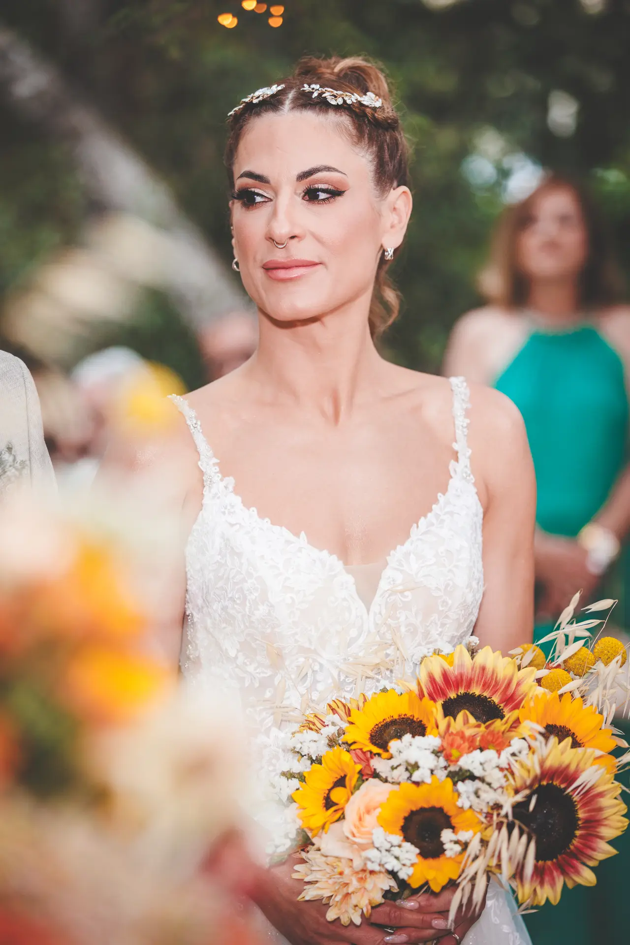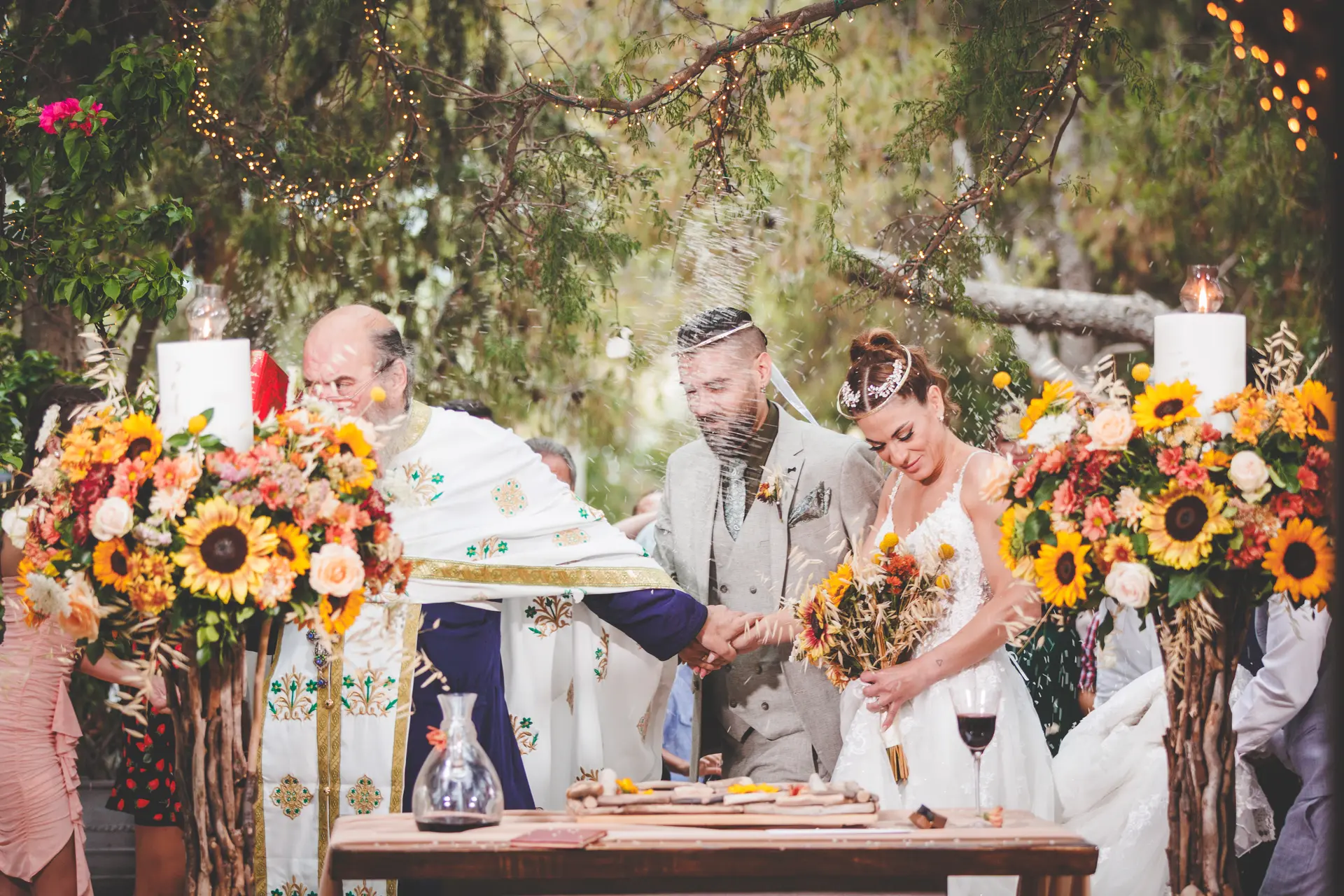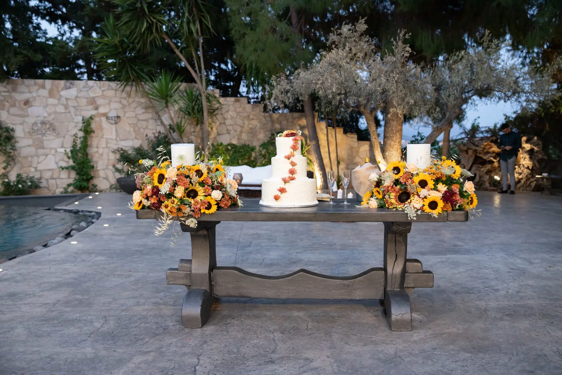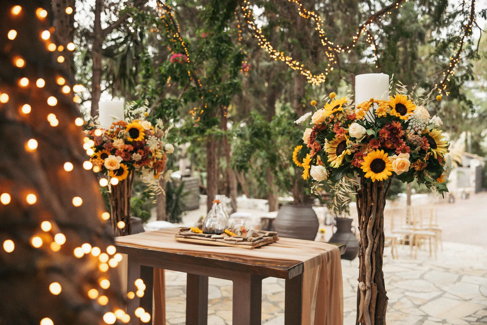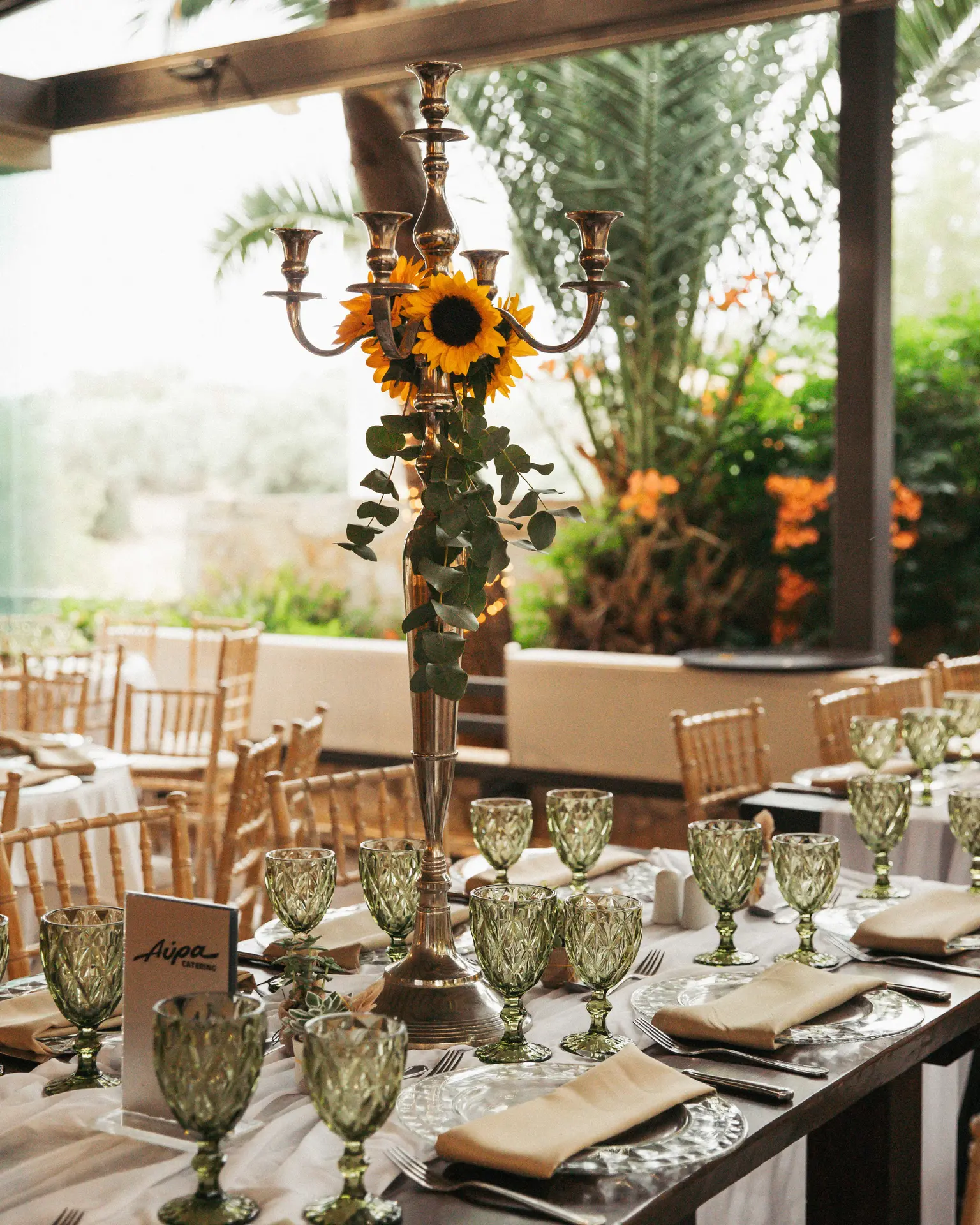 Η δημιουργική ομάδα του Kleopatra n’joy Events μετέτρεψε το κτήμα σε έναν καλοκαιρινό κήπο γεμάτο χρώμα, όπου τα ηλιοτρόπια συνδυάστηκαν με φυσικά υλικά και λιτές γραμμές, δημιουργώντας μια αισθητική που ανέδειξε την ομορφιά της απλότητας και τη δύναμη της λεπτομέρειας. Από τον χώρο της τελετής έως τη δεξίωση, κάθε γωνιά ακτινοβολούσε θετική ενέργεια και φυσική κομψότητα.