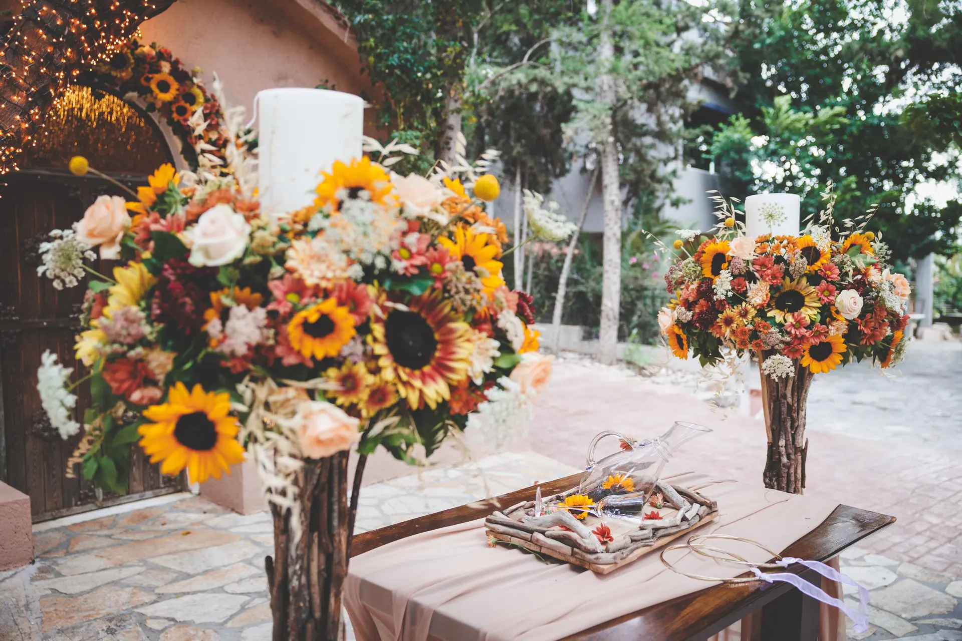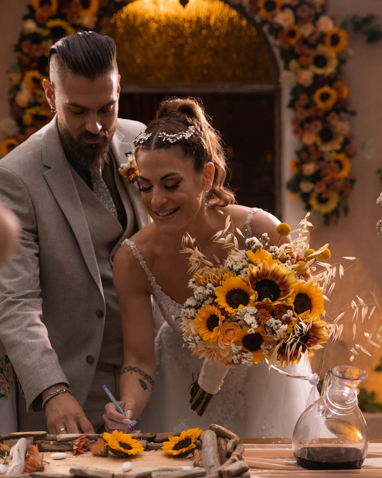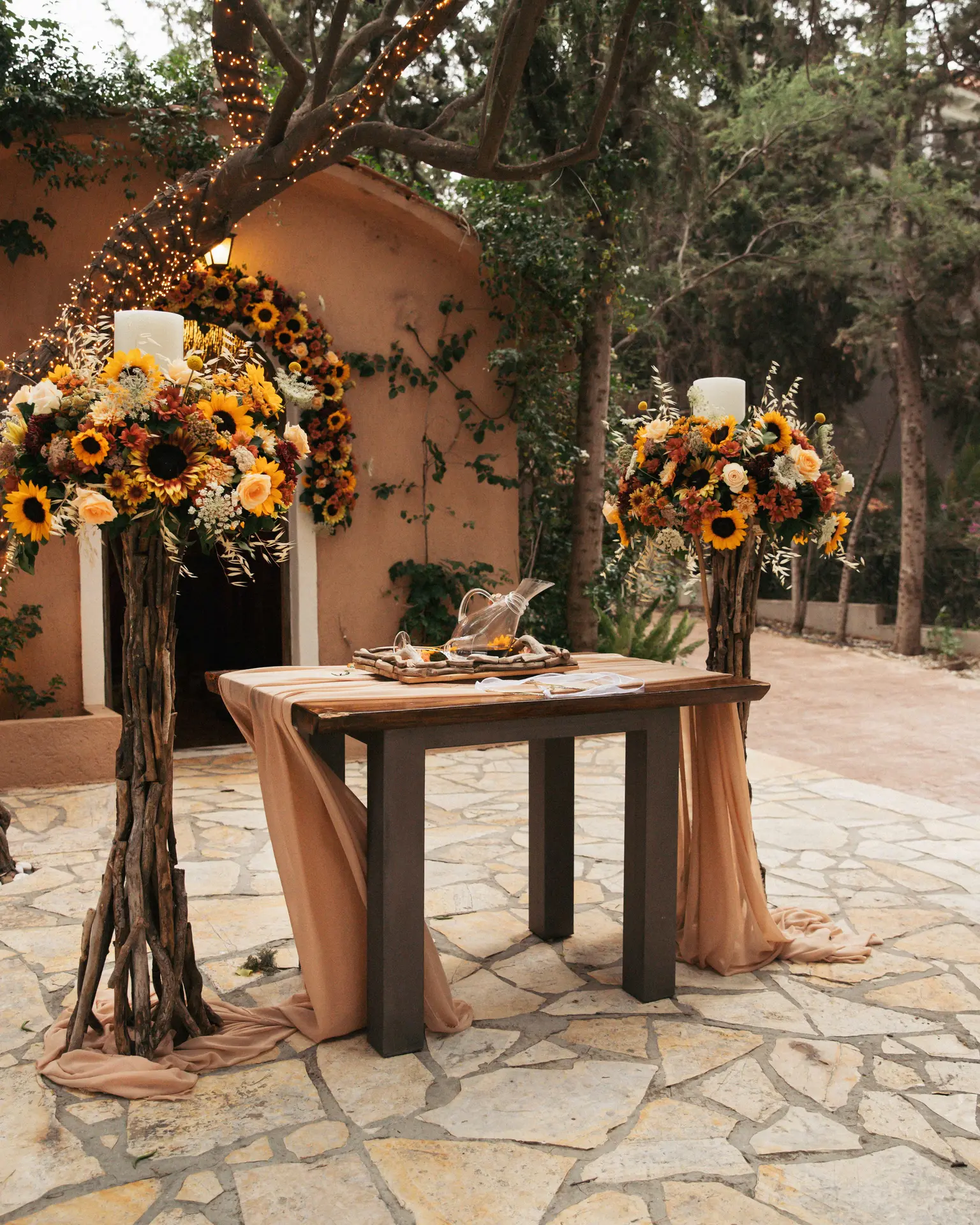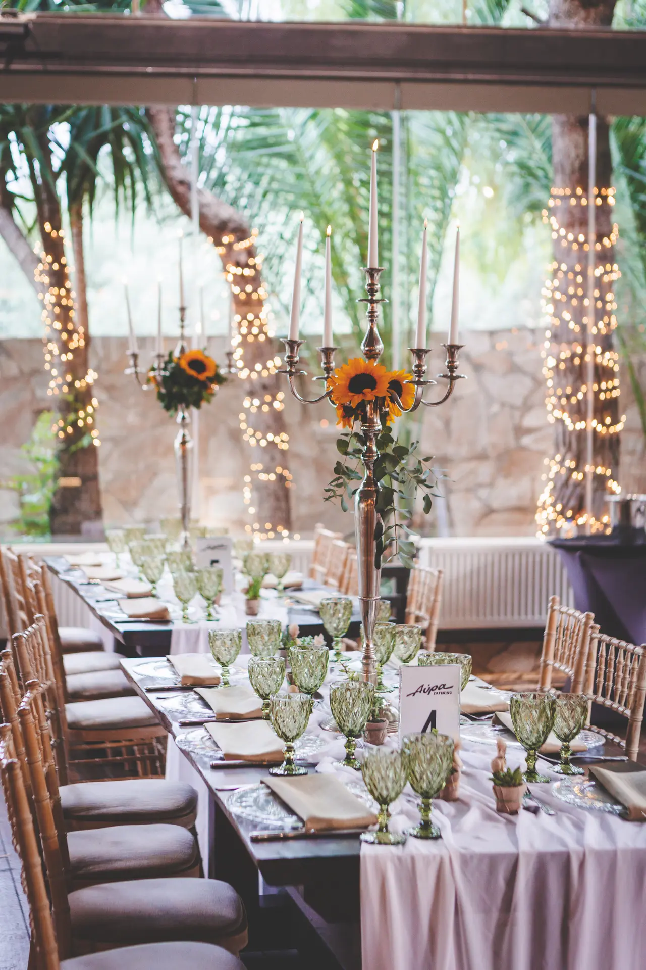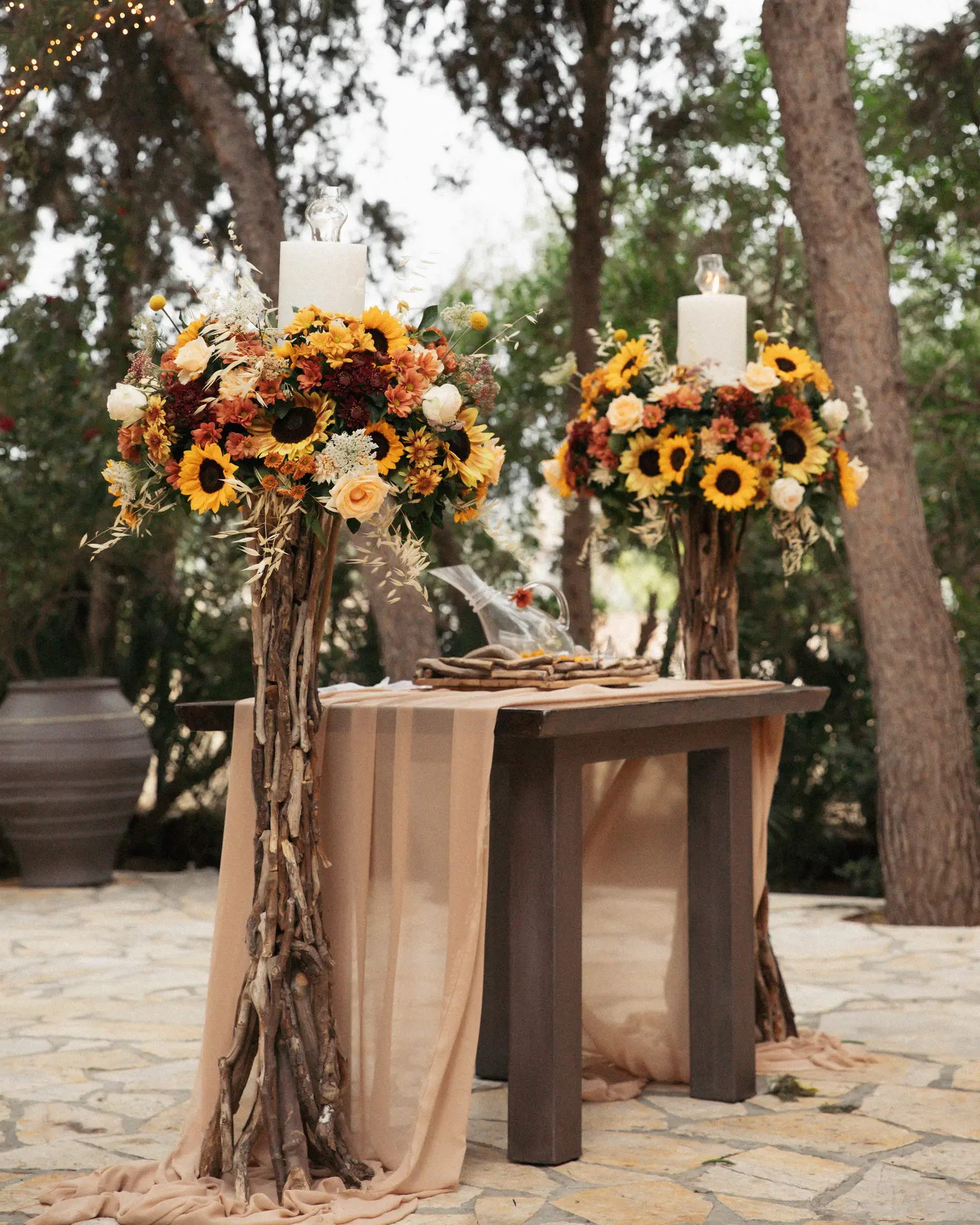 Η δημιουργική ομάδα του Kleopatra n’joy Events μετέτρεψε το κτήμα σε έναν καλοκαιρινό κήπο γεμάτο χρώμα, όπου τα ηλιοτρόπια συνδυάστηκαν με φυσικά υλικά και λιτές γραμμές, δημιουργώντας μια αισθητική που ανέδειξε την ομορφιά της απλότητας και τη δύναμη της λεπτομέρειας. Από τον χώρο της τελετής έως τη δεξίωση, κάθε γωνιά ακτινοβολούσε θετική ενέργεια και φυσική κομψότητα.