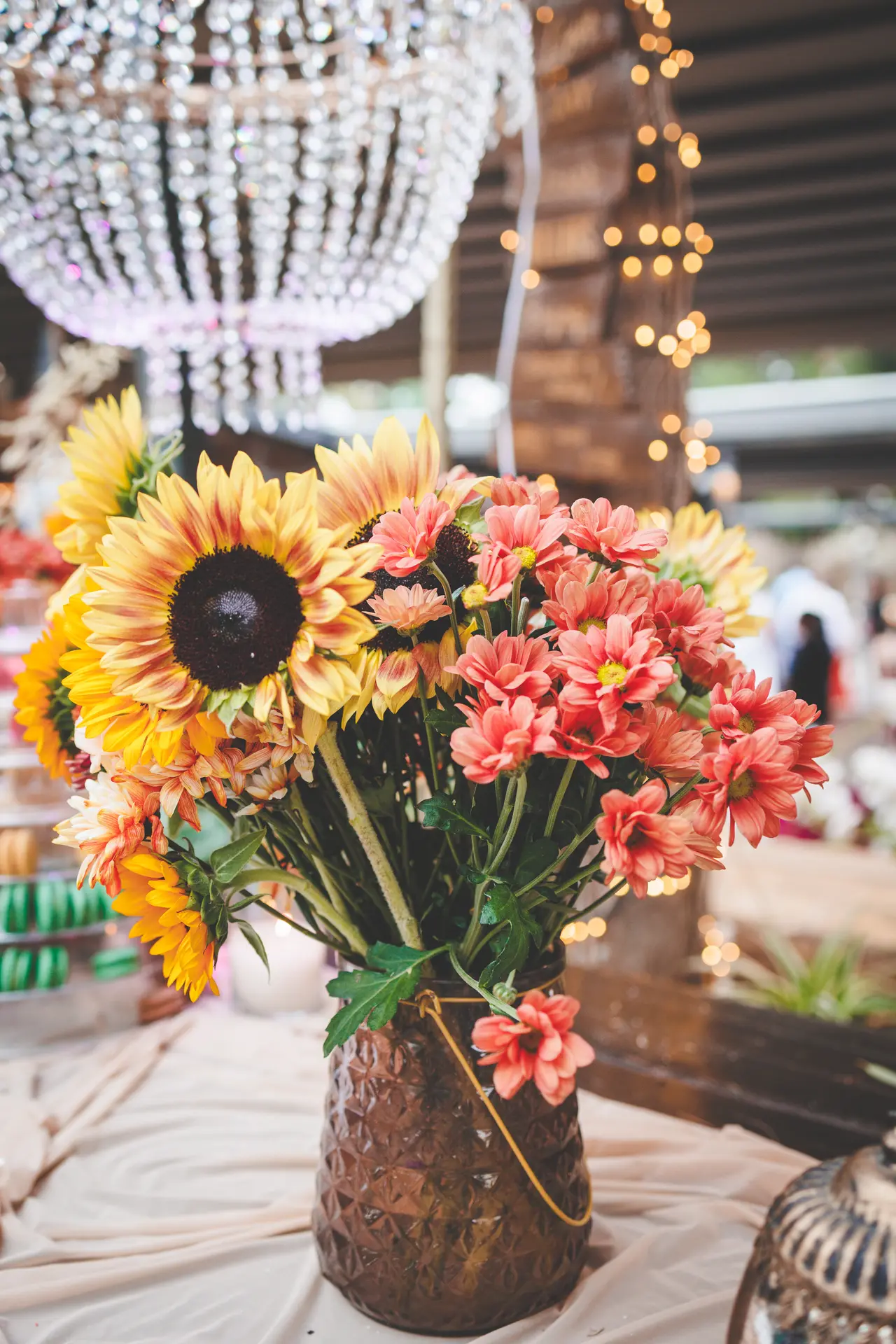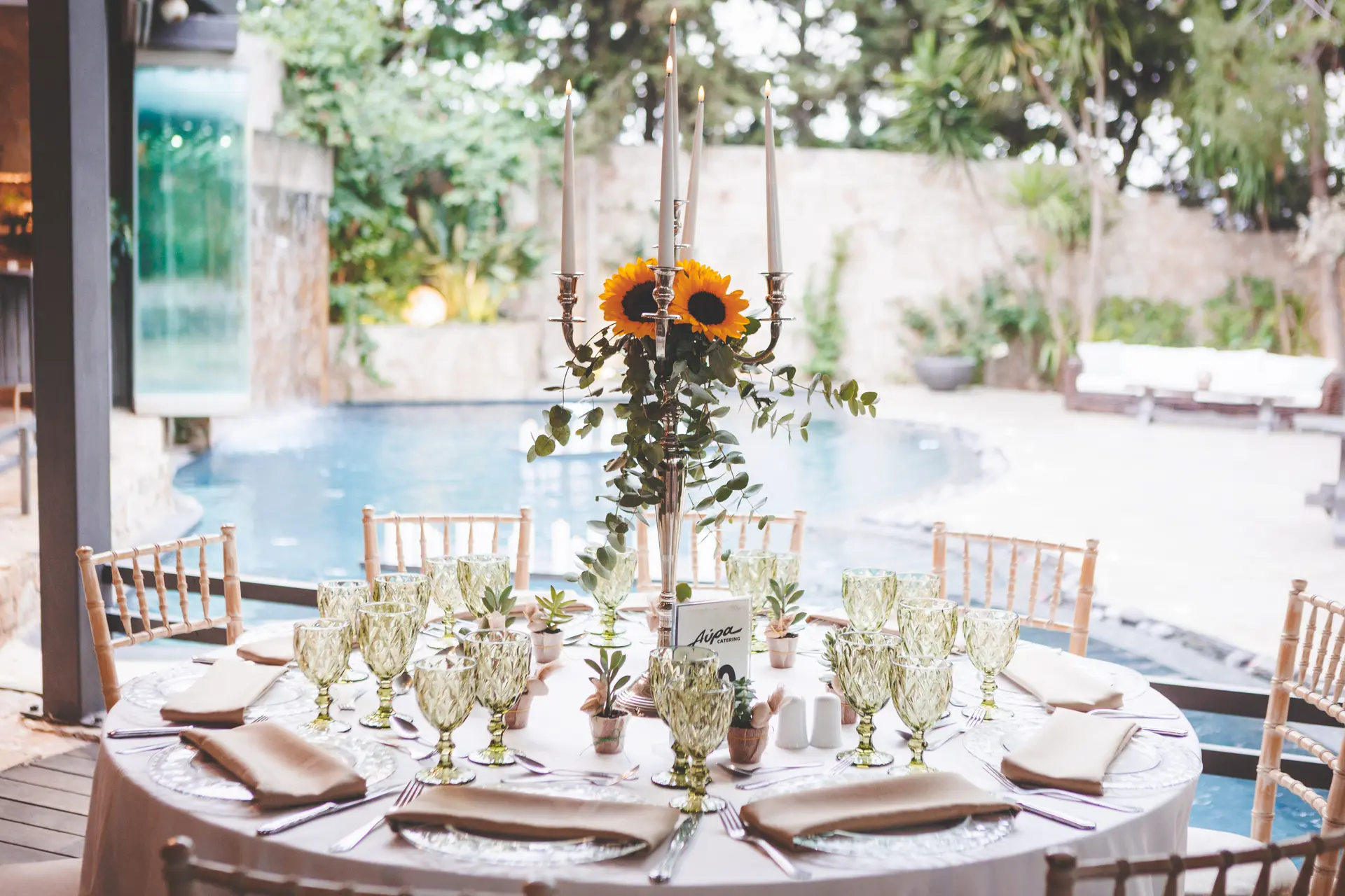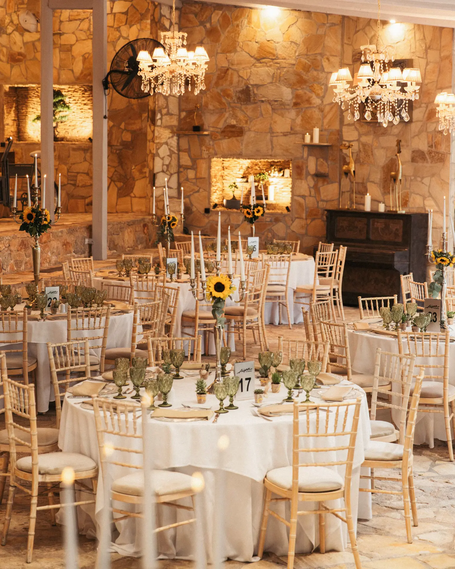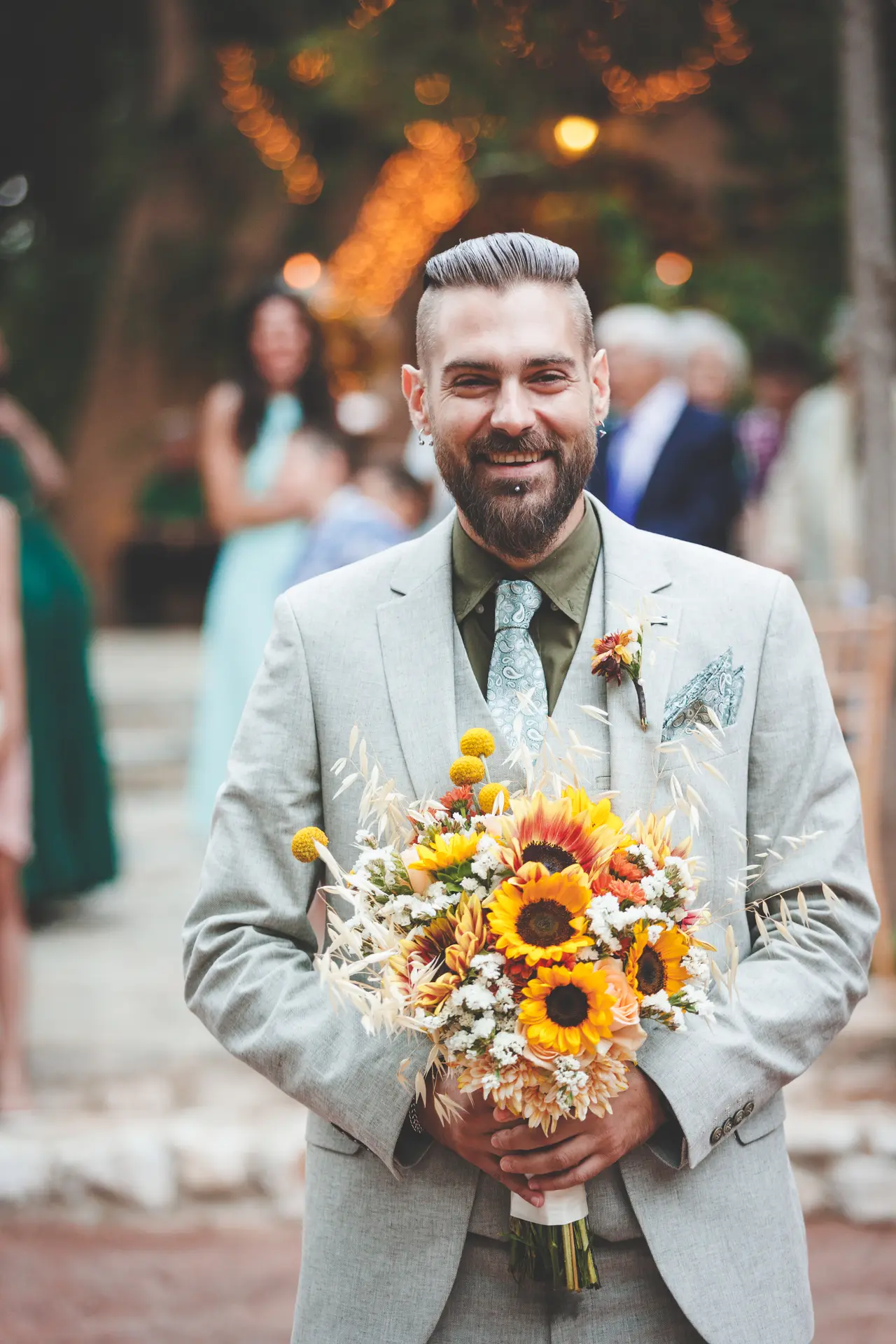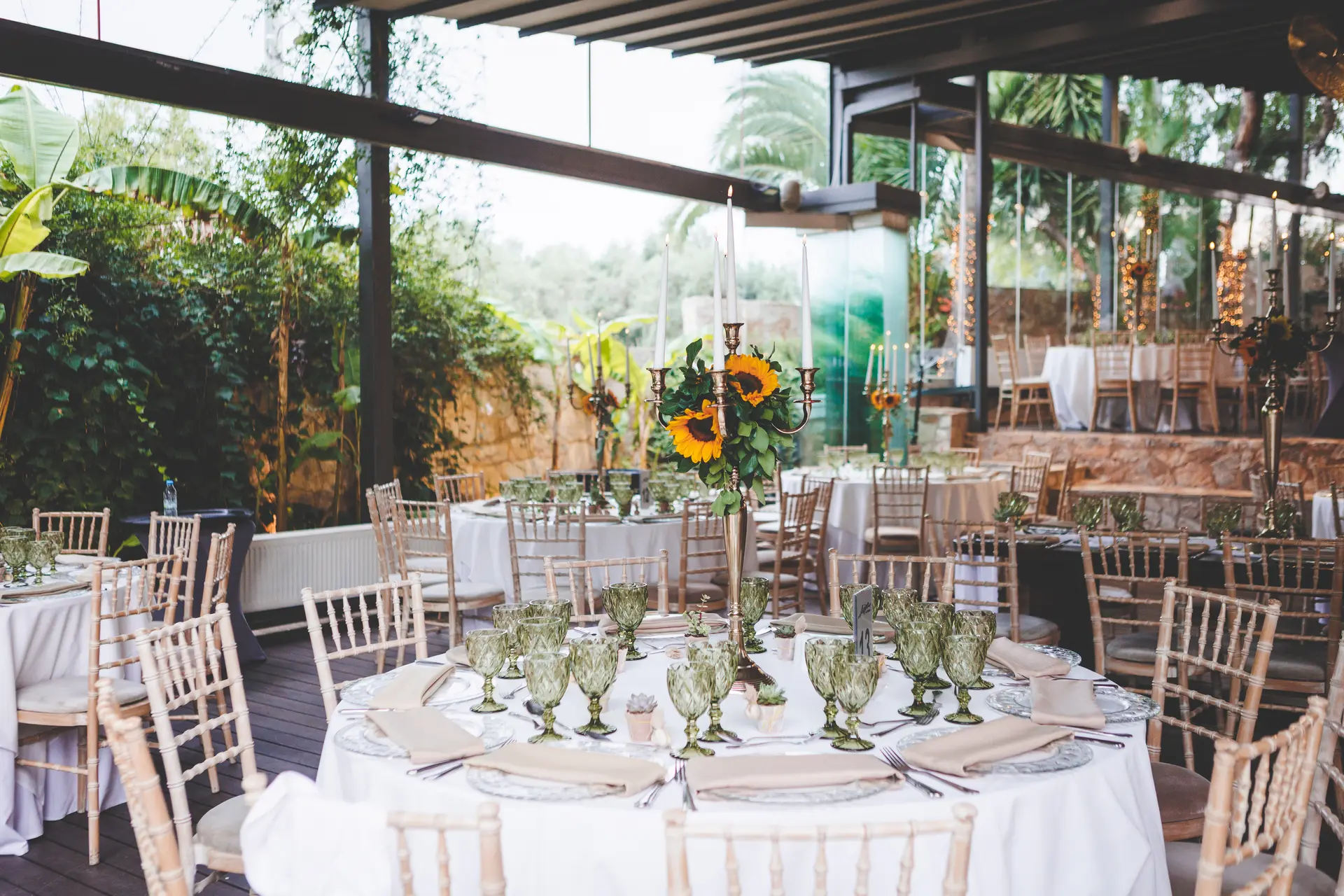 Η δημιουργική ομάδα του Kleopatra n’joy Events μετέτρεψε το κτήμα σε έναν καλοκαιρινό κήπο γεμάτο χρώμα, όπου τα ηλιοτρόπια συνδυάστηκαν με φυσικά υλικά και λιτές γραμμές, δημιουργώντας μια αισθητική που ανέδειξε την ομορφιά της απλότητας και τη δύναμη της λεπτομέρειας. Από τον χώρο της τελετής έως τη δεξίωση, κάθε γωνιά ακτινοβολούσε θετική ενέργεια και φυσική κομψότητα.
