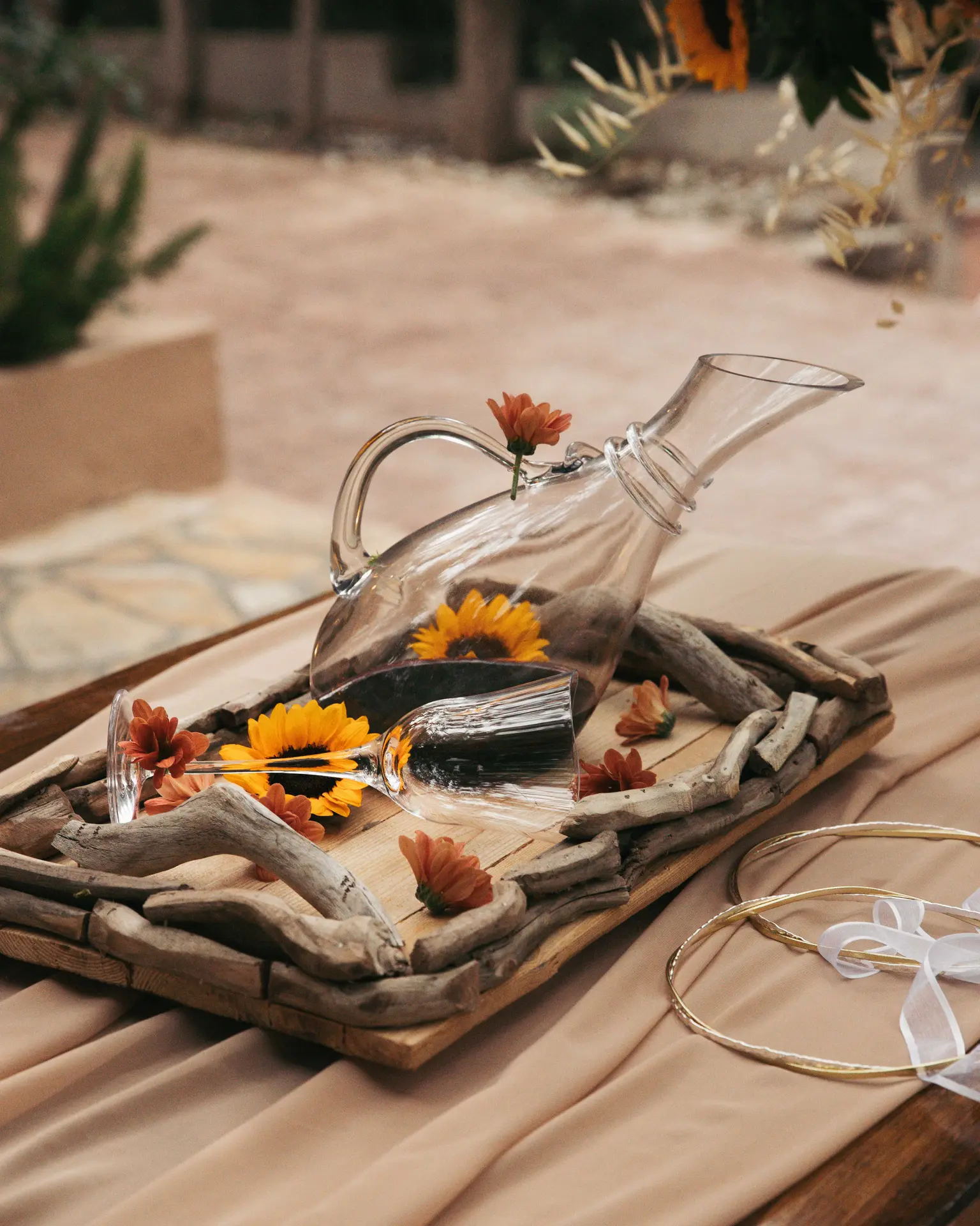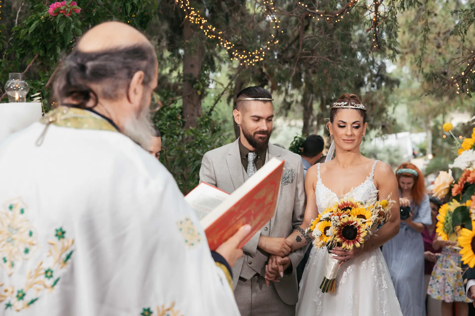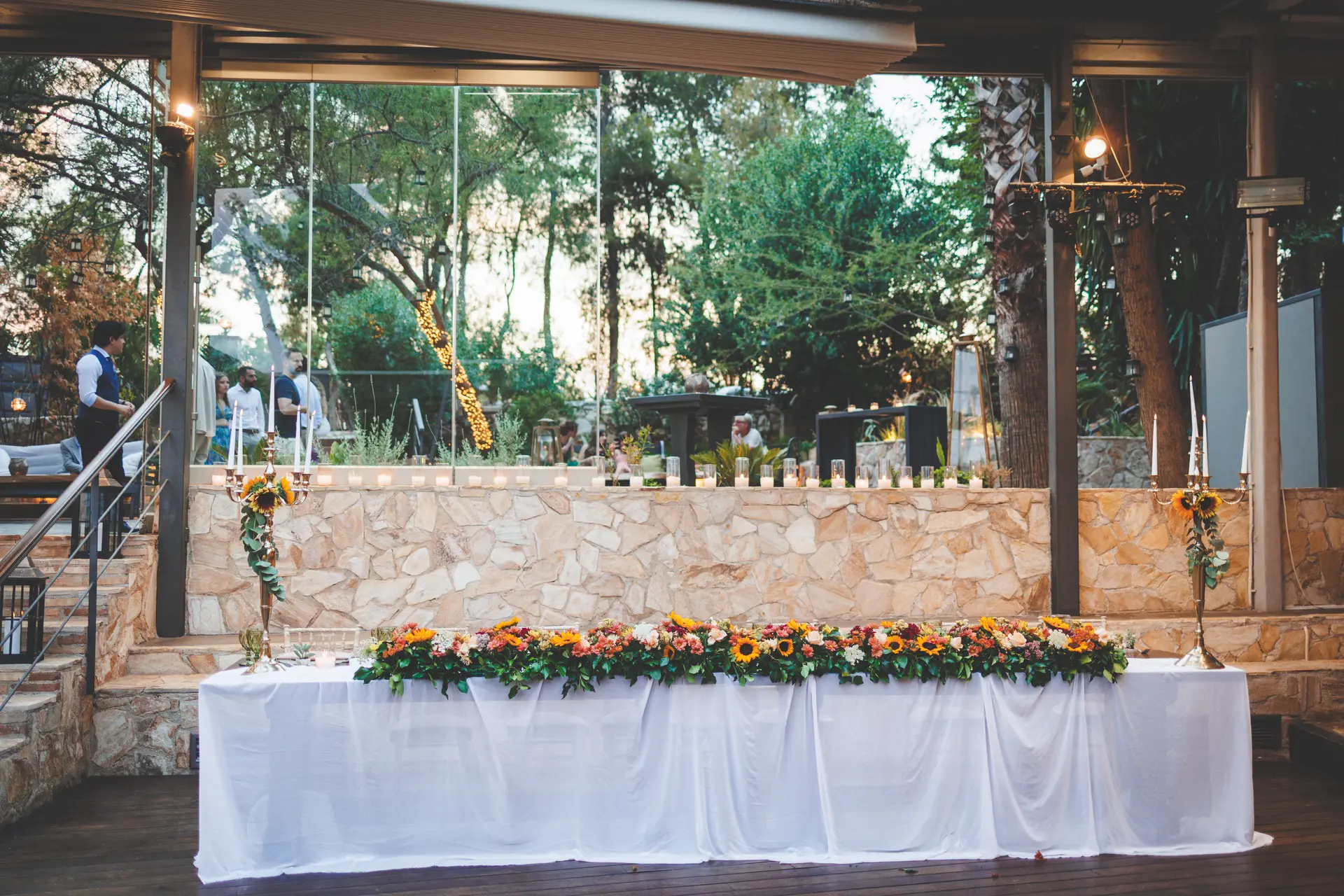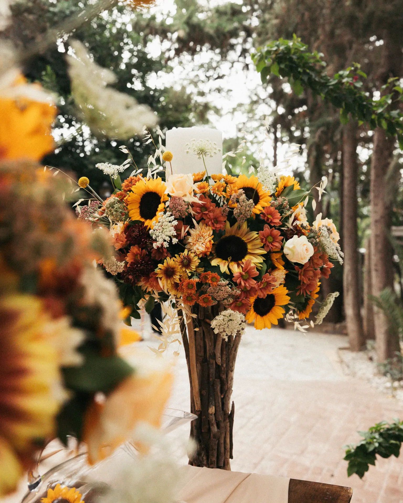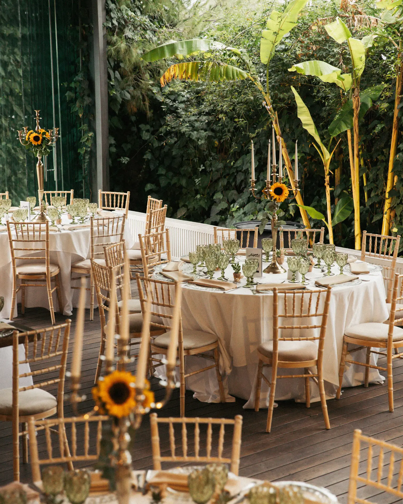 Η δημιουργική ομάδα του Kleopatra n’joy Events μετέτρεψε το κτήμα σε έναν καλοκαιρινό κήπο γεμάτο χρώμα, όπου τα ηλιοτρόπια συνδυάστηκαν με φυσικά υλικά και λιτές γραμμές, δημιουργώντας μια αισθητική που ανέδειξε την ομορφιά της απλότητας και τη δύναμη της λεπτομέρειας. Από τον χώρο της τελετής έως τη δεξίωση, κάθε γωνιά ακτινοβολούσε θετική ενέργεια και φυσική κομψότητα.