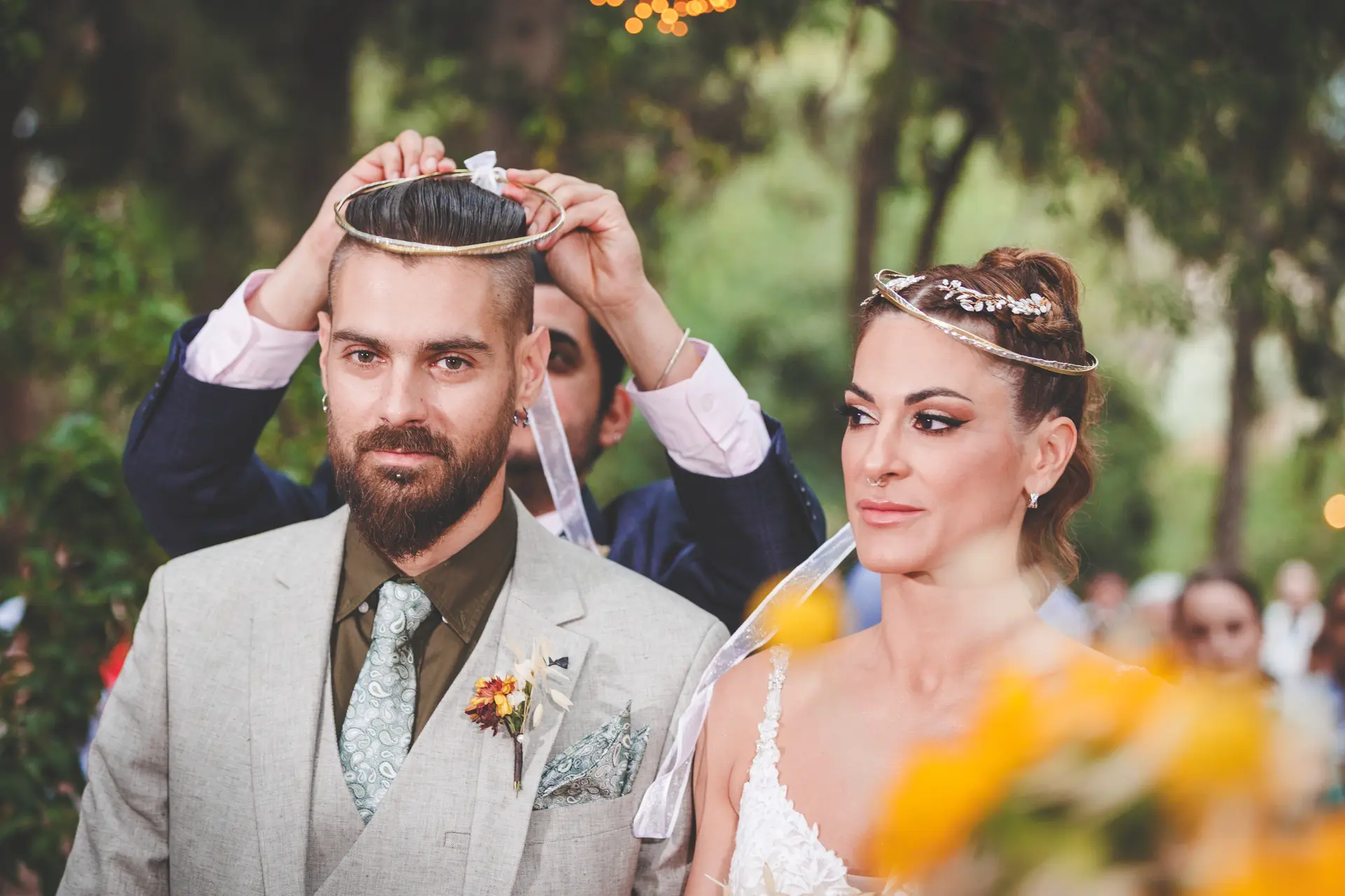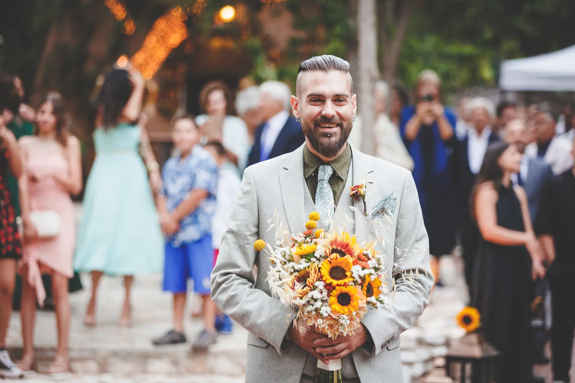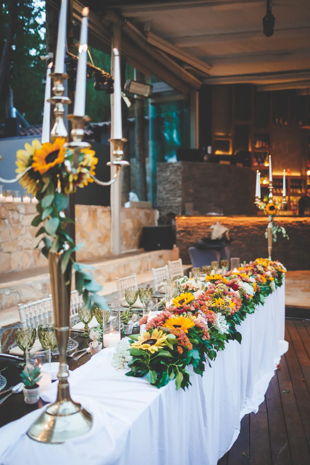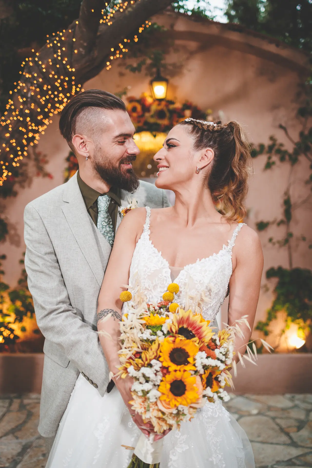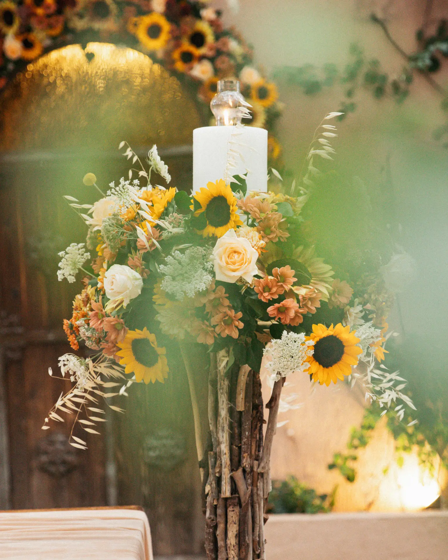 Η δημιουργική ομάδα του Kleopatra n’joy Events μετέτρεψε το κτήμα σε έναν καλοκαιρινό κήπο γεμάτο χρώμα, όπου τα ηλιοτρόπια συνδυάστηκαν με φυσικά υλικά και λιτές γραμμές, δημιουργώντας μια αισθητική που ανέδειξε την ομορφιά της απλότητας και τη δύναμη της λεπτομέρειας. Από τον χώρο της τελετής έως τη δεξίωση, κάθε γωνιά ακτινοβολούσε θετική ενέργεια και φυσική κομψότητα.